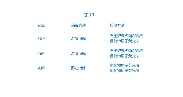 在食品進(jìn)出口中,重金屬是必檢項(xiàng)目,其消解方法和檢測(cè)方法見表3.1。