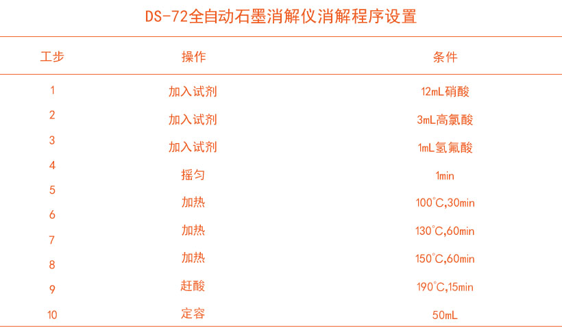 加入12mL硝酸+3mL高氯酸+1mL氫氟酸,搖勻1min,然后程序自動升溫至100℃,保持30min,此時消解管中有濃重的紅棕色煙霧冒出,繼續消解樣品將溫度升溫至130℃,保持60min,溫度升溫至150℃,保持60min,到時的樣品應該消解至淡黃色澄清透明狀態,全自動石墨消解儀升溫至190℃,保持15min進行趕酸,趕酸完全后使用超純水定容至50mL待測。同時做空白樣試樣。