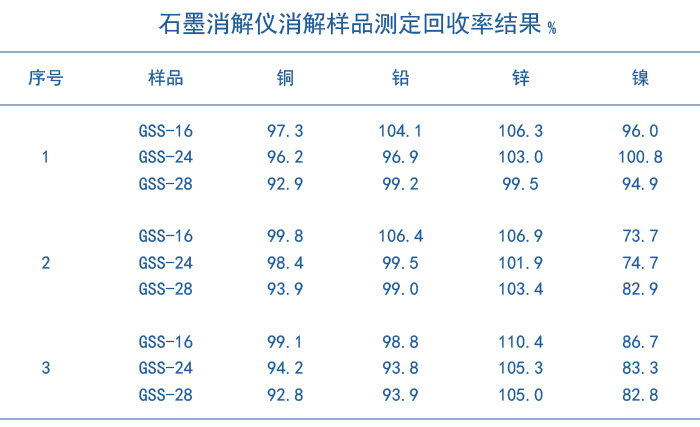 (2)由圖表3、圖表4可以看出三種程序消解樣品的土壤重金屬銅、鉛、鋅都有很好的消解回收,但是第一種程序?qū)χ亟饘冁嚨幕厥蘸茫瑢ν寥罉?biāo)準(zhǔn)物質(zhì)GSS-16、GSS-24和GSS-28的回收率分別達(dá)到了96.0%、100.1%和94.9%。