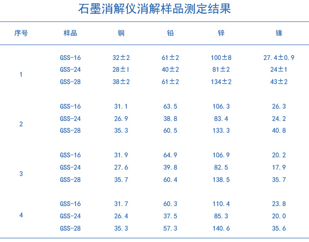 分別準(zhǔn)確稱取(GSS-16)、(GSS-24)、(GSS-28)標(biāo)準(zhǔn)樣品各為0.200g置于聚四氟乙烯消解管中,用少量水濕潤,加入一定比例的硝酸、高氯酸、氫氟酸和鹽酸,按照無線平板上的程序升溫加熱(升溫程序如下圖表1所示),消解管加蓋,上機消解,開蓋,繼續(xù)趕酸至消解管內(nèi)只剩下透明粘稠近干膏狀物,待消解管溫度降至室溫,取出消解管在通風(fēng)櫥中,用慢速定量濾紙將消解后溶液過濾并用高純水定容至25mL容量瓶內(nèi),上機測定。樣品做三個平行,同時做試劑空白。