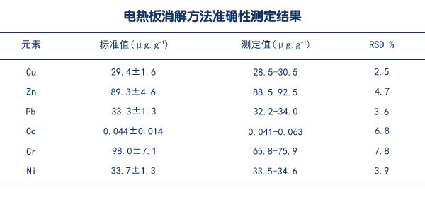 按電熱板消解法,分別稱取土壤標準樣品GSBZ50013—1988(ESS-3)各5份,按照第1.3節所述的方法進行消解實驗,測定結果見下面表格。從表中可以看出:
