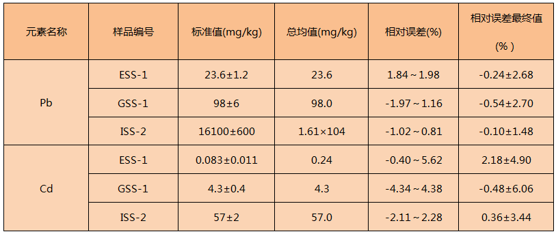 采用方法四中的步驟對(duì)鉛、鎘的ESS-1、GSS-1和ISS-2標(biāo)準(zhǔn)樣品進(jìn)行了消解測(cè)定鉛、鎘準(zhǔn)確度結(jié)果如下表所示: